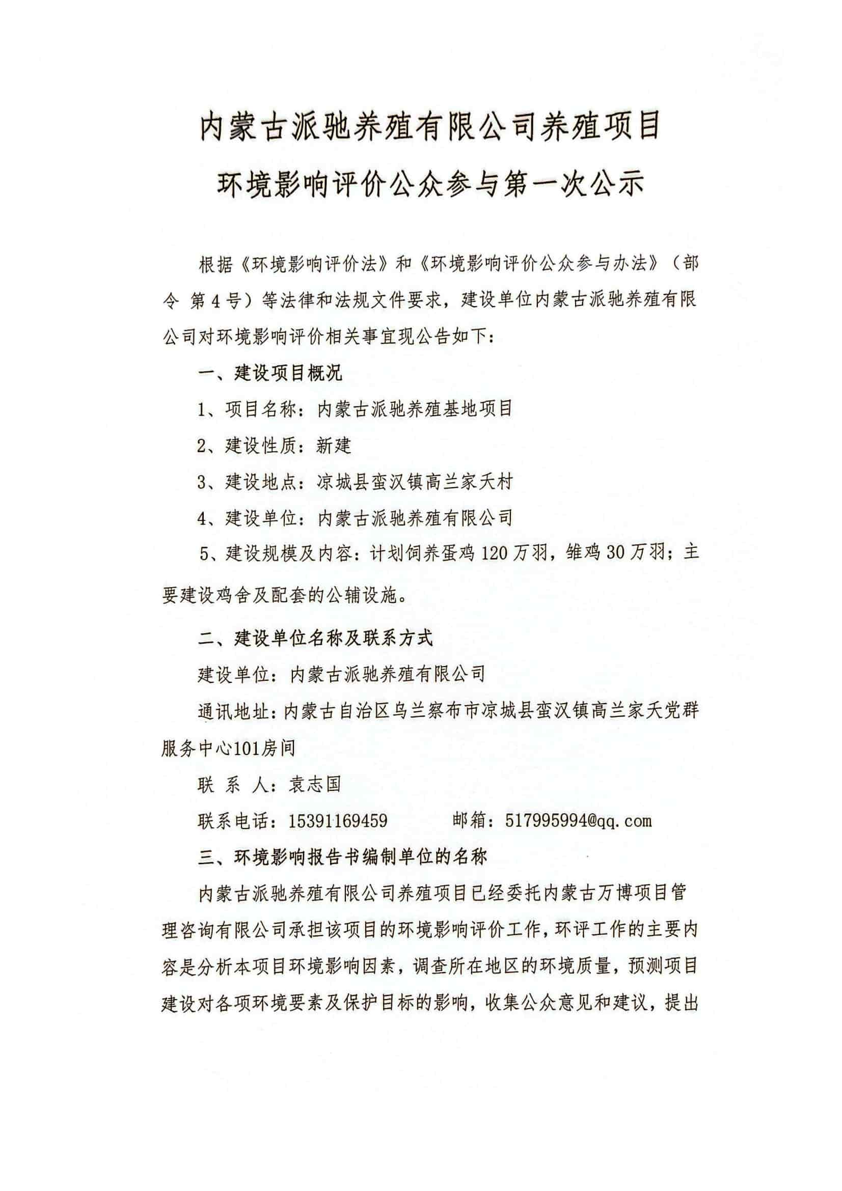 內蒙古派馳養(yǎng)殖有限公司養(yǎng)殖項目環(huán)境影響評價公眾參與第一次公示